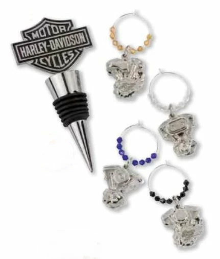 Set includes Bar & Shield bottle stopper and four custom tooled H-D Engine shaped wine charms with different colored beads Knucklehead (gold), Panhead (black), Shovelhead (clear), and Evolution (blue). Engine names engraved on back of each charm.
