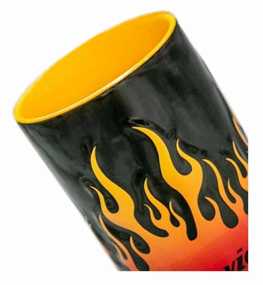 Grab a handful of your favorite brew with this sculpted, 3-dimensional flames 15-ounce ceramic coffee mug. Flames roar up from the base of the mug on a black background. The Harley-Davidson® logo is at the bottom. The interior is yellow and the handle is large. Feel free to heat in the microwave; it is also dishwasher safe. This particular mug is one of the more popular Harley® branded mugs around. As a gift, it’s perfect.