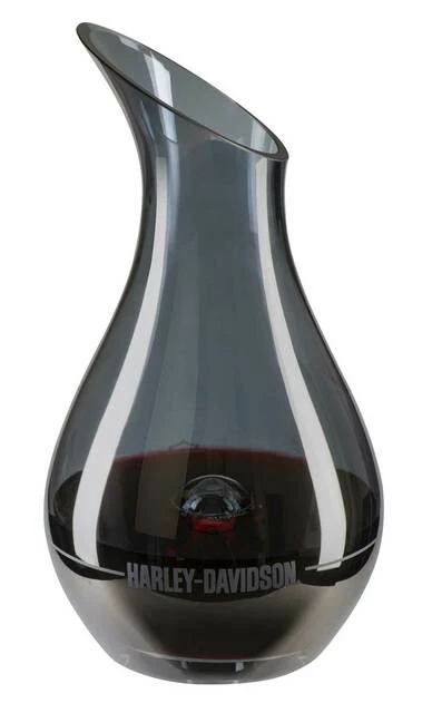 - Harley-Davidson® Wine Decanter, HDX-98723. Size: 50 oz. Made from high-quality glass. Electroplated smoke gray finish with frosted Harley-Davidson® and Silhouette Bar & Shield logos. Hand wash only. Dimensions: 5.3″ diameter x 10″ H.