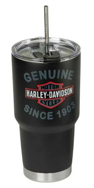 Harley-Davidson® Genuine Travel Mug & Tumbler Set, HDX-98640. Set includes 12 oz. mug with lid and 30 oz. travel tumbler with lid and stainless steel straw. Both are double-wall stainless steel (vacuum insulated). Genuine Harley-Davidson® logos on mug and tumbler. Harley-Davidson® font on straw. Hand wash only. Do not microwave.