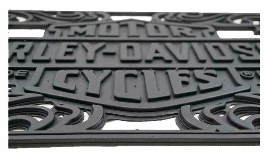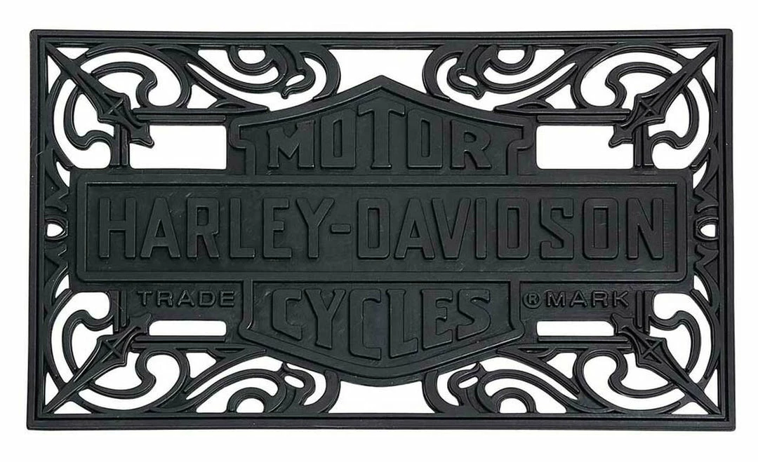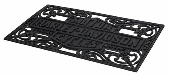 It’s no surprise that this doormat resembles a tough wrought iron ornamental gate, featuring the nostalgic Harley-Davidson® Bar & Shield® logo. After all, toughness is synonymous with Harley-Davidson® and Harley-Davidson® riders. There can be no better welcome to riders and guests to your home than knowing they will be standing on the threshold of a tough Harley® family. Remember, it’s more than a doormat. It makes a statement that we are at once mythical, fiercely independent, that there’s a lot of rebel in us, but above all we are quintessentially American. And just like wrought iron, this mat is made to last. Made with durable, high-performance, shock-absorbing rubber, this ½-inch entry mat is just what is needed to keep moisture and dirt outside. It will not crack or buckle, and it resists fading, mold, and mildew. Because it is a non-slip mat it easy to care for – simply hose off to clean. To say your guests will be standing on the doorstep of greatness may be a bit of hyperbole, yes, but the message is clear. We are a Harley® family. Welcome!