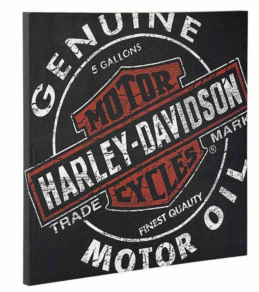 When your lifestyle includes a relentless pursuit of freedom on the open road, your home base should show it. Add the H-D® Oil Can Label Canvas Print to your home décor and bring the Harley® vibe into your family room or man cave. Vivid colors make a striking display with high-resolution printing on polyester canvas. The slightly distressed appearance shows character and the wrap-around presentation stretched over a hard-wood frame adds dimension to this modern presentation of a classic American brand.