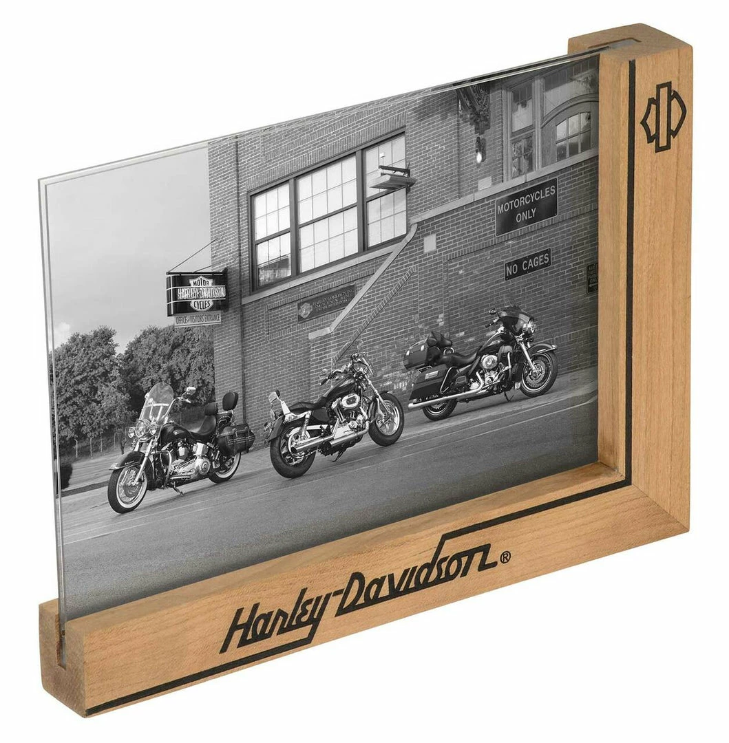 Harley-Davidson® Chopped Picture Frame – 5 X 7, HDX-99215. Asymmetrical L-shaped wood frame with engraved Harley-Davidson® font on both sides. Acrylic insert displays two photos back-to-back. Holds 5″ x 7″ photo. Dimensions: 8″ L x 6″ H.