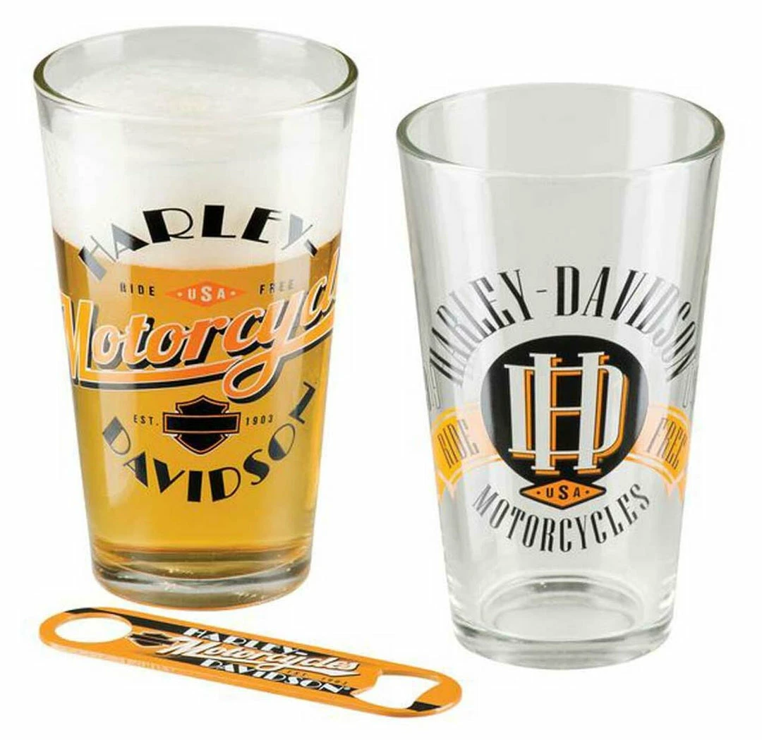 - Harley-Davidson® Ride Free Pint Glass Set, HDL-18798. Set of two 16 oz. pint glasses with complementing retro designs and bonus stainless steel bottle opener. Hand wash only. Do not microwave. Opener dimensions: 4.75″ L x 1″ W.