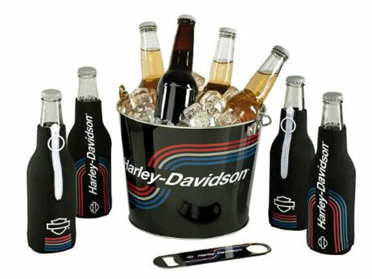 - Have party will travel. Whether you’re heading out on a day ride, to the local ball park for a pre-game tailgate, or just out to your back yard for a little serious down time, the H-D® Tank Graphic Party Bucket Set covers the essentials. The 5-quart metal bucket displays a classic curved-stripe tank graphic complementing the Harley-Davidson® brand ID, and holds mounds of ice to chill your bottled adult beverages. The 4 zip-up neoprene bottle koozies present alternating graphics, all including a stripe pattern, two with the vertical Harley-Davidson® signature and two with the unmistakable Bar & Shield® silhouette. And, the convenient vinyl-rapped 7″ long bottle opener completes the set. From the retro Harley® graphics to the DIY bar set-up, this bucket set greets your guests with fellow-rider hospitality that goes the distance. Hand wash only. Set includes a 5-quart metal bucket, four neoprene bottle-zip koozies and a vinyl-wrapped bottle opener. Ace Product Management