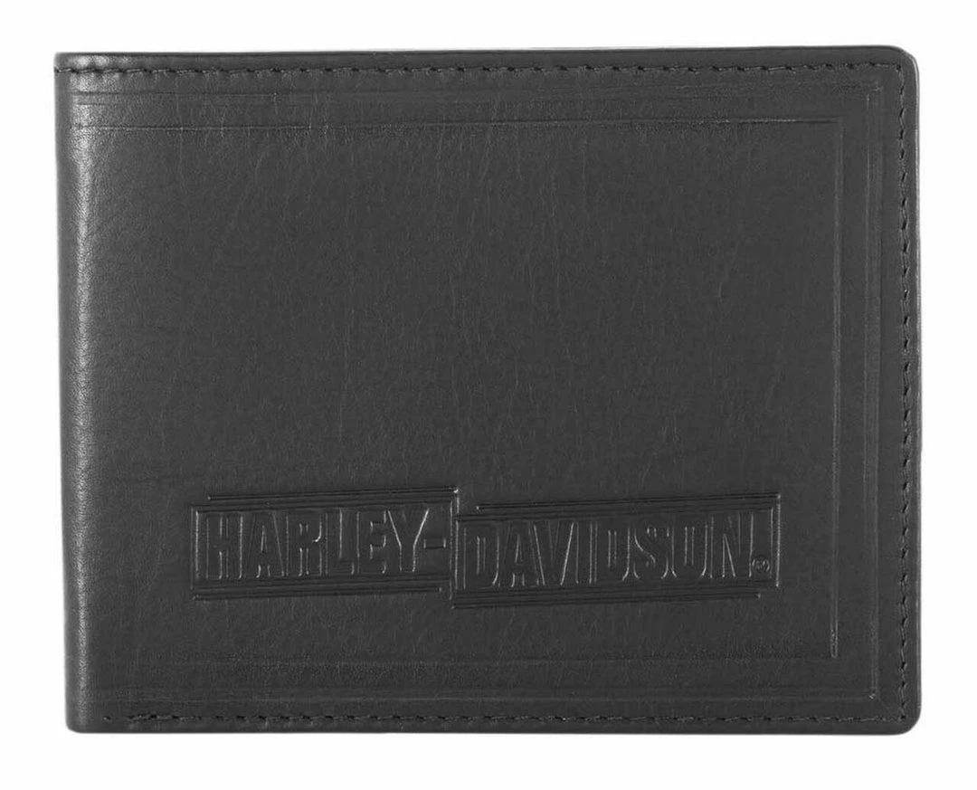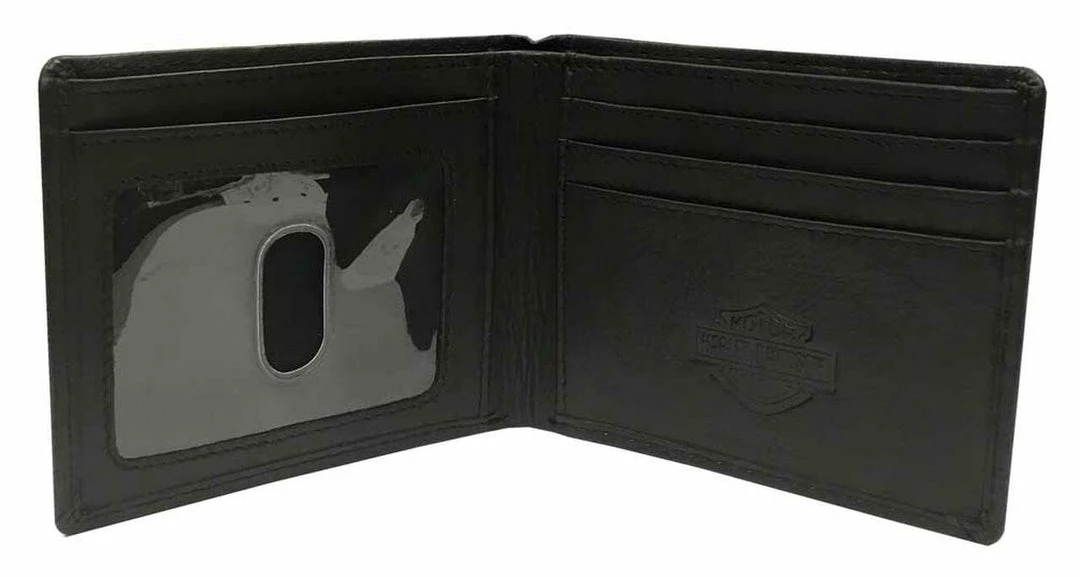 Made of high-quality black genuine leather with a smooth, soft texture. The best materials make up the long-lasting wallets. Features debossed bold Harley-Davidson® script. Interior features: 3 credit card slots, ID window and cash slot. Antique nickel finish. RFID Protection, blocks hackers from reading your information. Size: 4.5″ x 3.5″. Perfect size to fit in the pocket of your jacket or jeans.