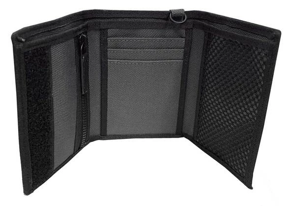 Made of high-quality gray polyester with contrasting black nylon trim. Features a rubberized Bar & Shield logo. Interior features: 3 credit card slots, zippered coin pocket, mesh ID window and cash slot. Matte black finish on zippers and biker chain ring. Secure velcro closure. RFID Protection, blocks hackers from reading your information. Size: 3.25″ x 4.5″. Perfect size to fit in the pocket of your jacket or jeans.