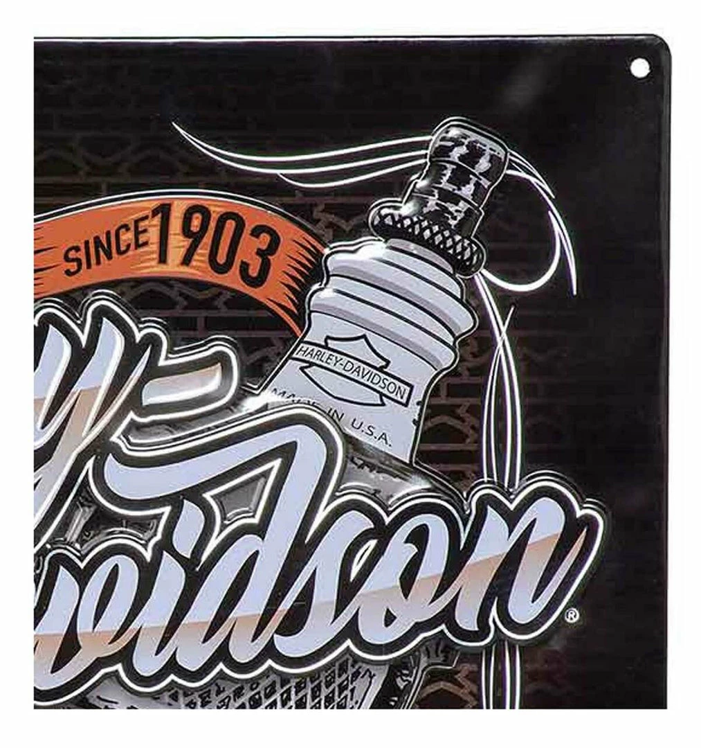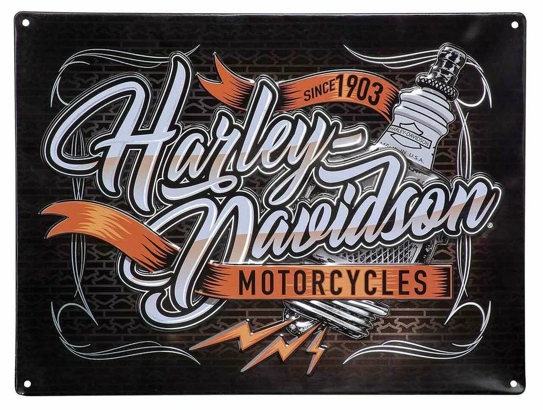 Harley-Davidson® Spark Plug Tin Sign, HDL-15532. H-D Motorcycles Spark Plug design makes a great tin sign! Embossed accents and vibrant colors add depth and dimension. Smooth edges for safe handling. Includes holes for easy hanging. Dimensions: 15.75″ W x 12″ H.