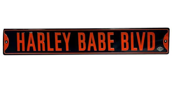 Harley-Davidson® Harley® Babe Blvd Embossed Tin Sign, 2012181. Features a custom, high-quality graphic embossed on tin sign. Totally awesome Boulevard 3 ft. sign! Inspired by traditional metal street signs, this classic black & orange visual announces the fabulous female rider status. The detailing on the sign is awesome because the graphic is lithographed on tin-plate using a three dimensional process resulting in unbelievable depth and character. This metal sign is sure to be a welcome addition to your garage, shop, bar, gameroom or any other room you see fit! Makes great gift for your Harley enthusiast friends. Convenient holes for hanging. Size: 36″ x 6″.