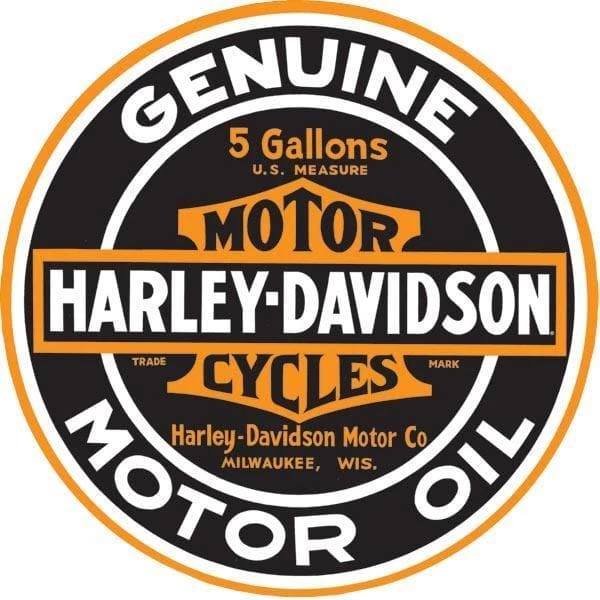 This is an enamel on steel Harley Davidson Motor Oil emblem that measures 2 1/4″ diameter. The enamel colors are orange, black and white. The emblem reads, “5 Gallons Motor Oil”. There is a magnet on the back side.