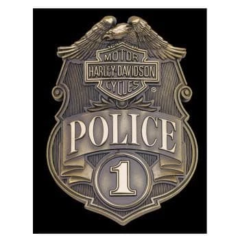 This sign memorializes Harley-Davidson’s® rich history of supporting our nation’s policemen. The sign has a black background with a police shield in the center with a Harley-Davidson® Bar & Shield® atop ”Police #1”. This is a trademarked logo. This rectangular sign, which displays in the vertical, features an awesome die-cut embossed police badge or shield graphic.