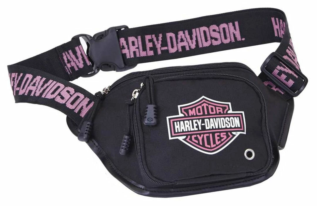 Sometimes a backpack is just too much. For a number of smaller items, this belt bag is perfectly sized and is worn around the waist – no fuss, no muss. Made with strong, water-resistant polyester with a self-healing nylon coil zipper, a classic Harley® Bar & Shield® is front and centered. The adjustable logo web belt comes with a Fastex® slip-lock closure. Both compartments are equipped with handle pull-tabs with small silhouette logos on each. The front zipper section has air grommets to keep things fresh. The bag is the perfect gab-and-go accessory for walking, shopping, riding, or just about anything where a backpack is too much.