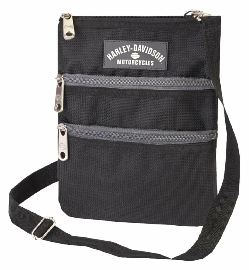 If you are looking for fashion-forward purses or handbags that are totally functional, then a crossbody bag might be just what you are looking for. The crossbody style is both classic and compact, which means it’s efficient. It’s a perfect fashion complement for many outfits, but more importantly, it’s worn by women who want to make a statement of independence and self-confidence: You are a Harley® Woman. With the shoulder strap, your arms and hands are free. And because it’s worn across the chest, it’s not going to slip out of place as your upper body moves to reach for this or that. It is black with the front zippers trimmed in a nice contrasting grey. There are three zippered pockets with logo pull-tabs, two on the front and one on the top. Quality made with strong water-resistant polyester, it is durable enough to use year after year. Both casual and functional, this crossbody gives you plenty of room for all of your must-haves, with the bonus of a convenient adjustable strap, which drops 14-inches and expands up to 49-inches. The strap is detachable so you can remove it and covert the bag to a hip-bag. On the front facing side of the bag, near the top, a rectangular dark grey Harley-Davidson® Motorcycles rubber logo badge is sewn on, featuring white lettering with a matching color filled Bar & Shield®.
