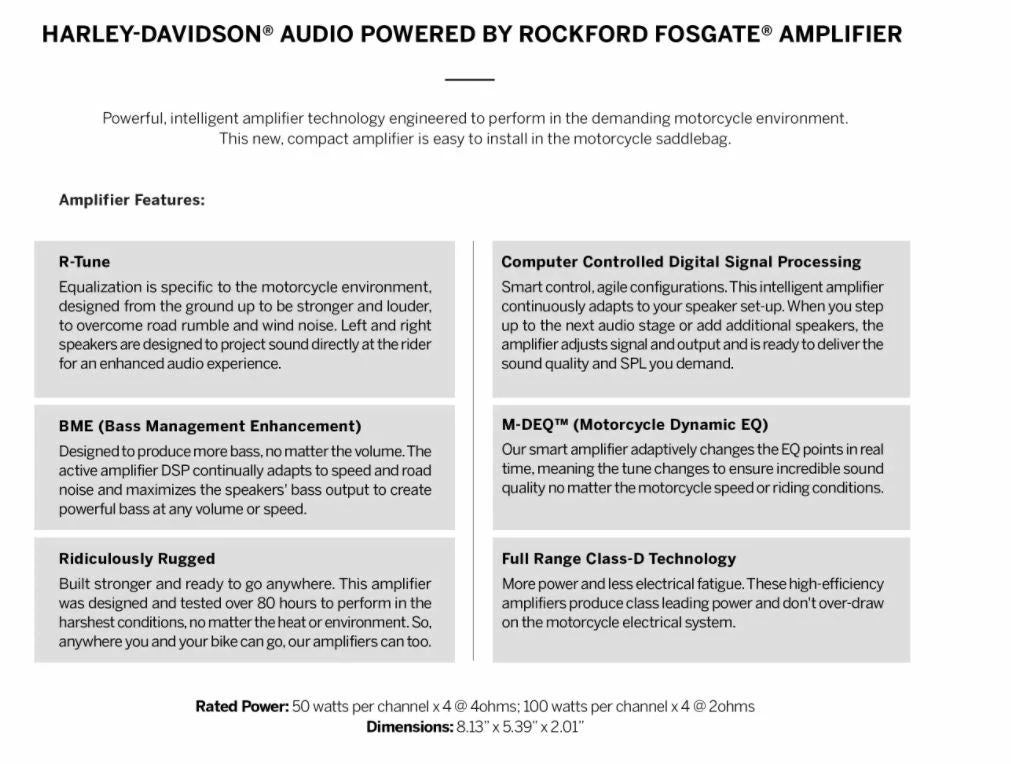 - Secondary amplifier required for any Harley- Davidson® Audio powered by Rockford Fosgate® six-speaker or eight-speaker system