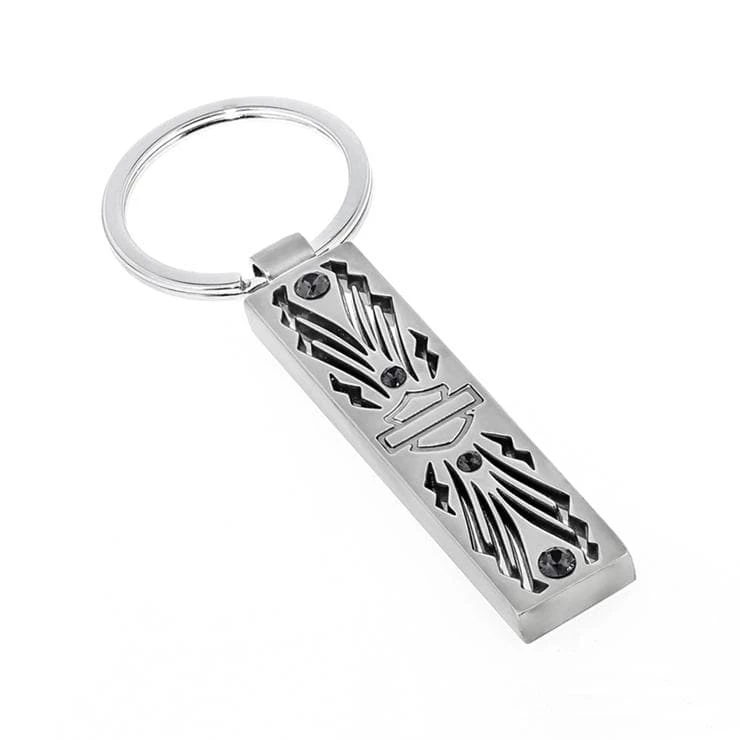 Express your Harley pride with this newly designed 2-sided cut-out polished metal key chain. Very unique design cut-outs in a rectangular metal bar with the Bar & Shield logo in the center. 4 sparkling round Swarovski crystals make this key chain even more unique. Secure sparkling Graphite color genuine Austrian Swarovski XIRIUS Chaton round crystals. 2 that are 4.05mm and 2 smaller 2.75mm. This key chain has a high polished finish and an easy slide key ring. Entire key chain measures 3 ½” long and over ½” wide and ¼ “ thick. Unique design and a sturdy metal construction. Our key chains are made of high end metal and manufactured using the finest materials and craftsmanship. Has a heavy coating for a lasting finish. Makes a ‘Harley-Davidson’ proud impression and a great gift. Packaged for protection. Official licensed product of Harley-Davidson