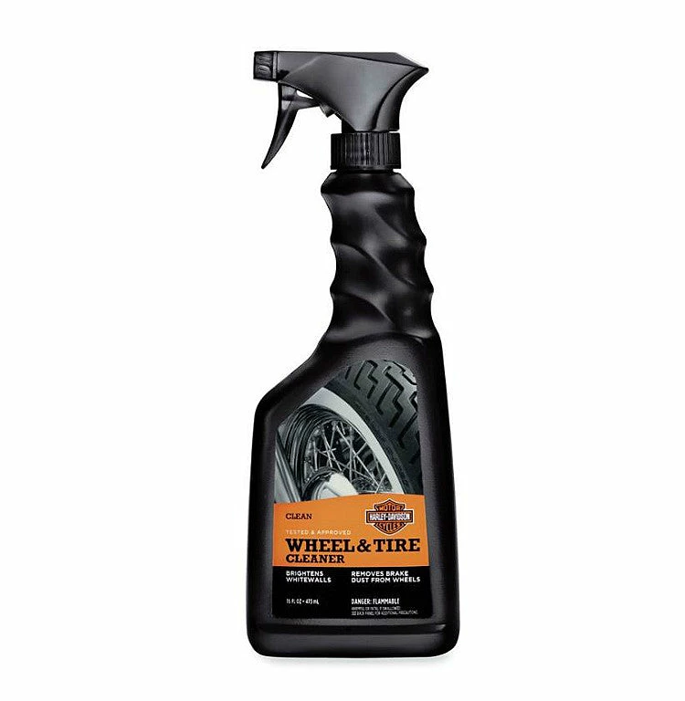 The road provides plenty of nasty elements that can be potentially damaging to the finish of motorcycle wheels. Wheel & Tire Cleaner safely removes brake dust and road grime from wheels, tires and whitewalls in seconds. 16 fl oz spray bottle. Harley-Davidson®. Made in the USA.