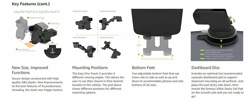 The Easy One Touch 3 provides a compact, versatile, and highly functional mounting solution. It offers a redesigned telescopic arm which extends up to 5 inches to provide users with even more viewing angles. Also included is an adjustable bottom foot that not only moves left and right but also up and down. As always, the Easy One Touch 3 includes the powerful iOttie sticky gel pad.