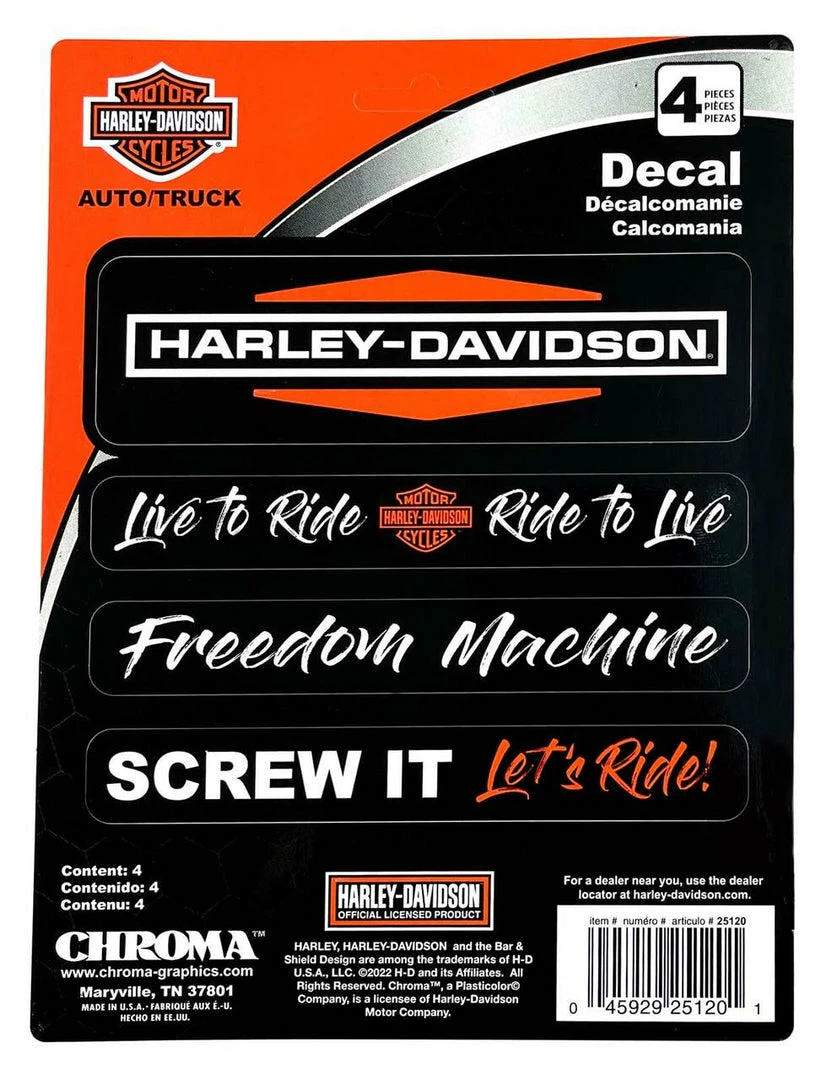 - Harley-Davidson® 4-Piece Sayings Decals, CG25120. Made from high-quality vinyl. Includes 4 decals total. Each decal features a famous H-D saying which include: Harley-Davidson® script, Live To Ride Ride To Live, Freedom Machine, Screw It Let’s Ride!Sheet Size: 6″ x 8″. Each decal is 5.25″ long. These stickers will adhere to any smooth, flat surface. Made in the USA