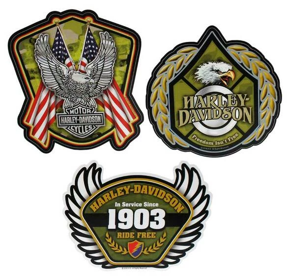 - Harley-Davidson® Salute Military Decals 3pc Stickers. CG45029. Package Measures: 6″ W x 8″ H Inches. Includes 3 Military Harley-Davidson® inspired decals, each decals features a different graphic. Sizes: Eagle Head; 5″ x 4.75″, Up-winged Eagle; 4.75″ x 5.25″ and 1903; 5.75″ x 4.25″. Made in the USA. CG45029