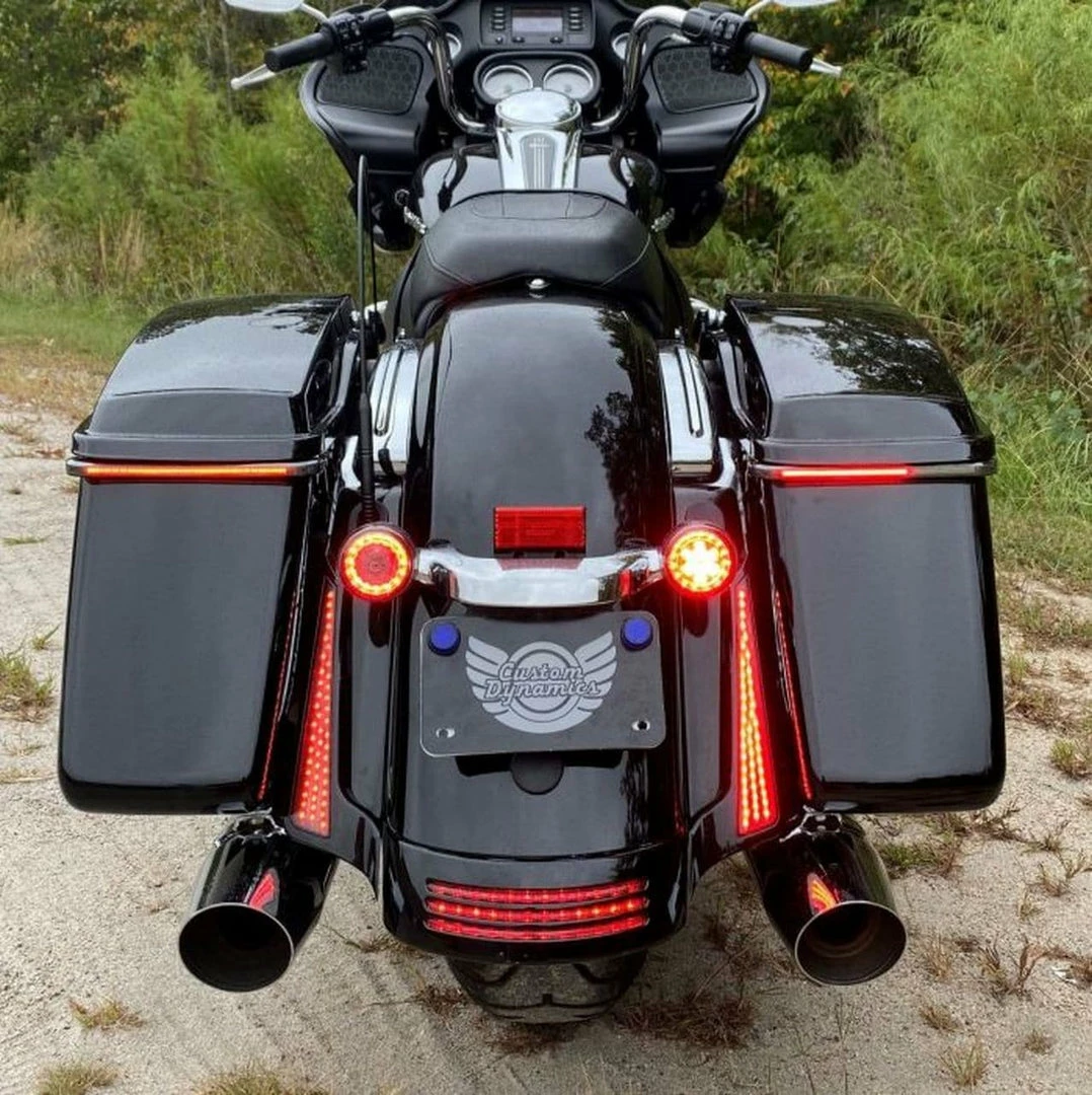 - Utilizing super bright red LEDs behind a red or smoked lens to provide contrasting red running light with full intensity brake light to the OEM hard saddlebags
