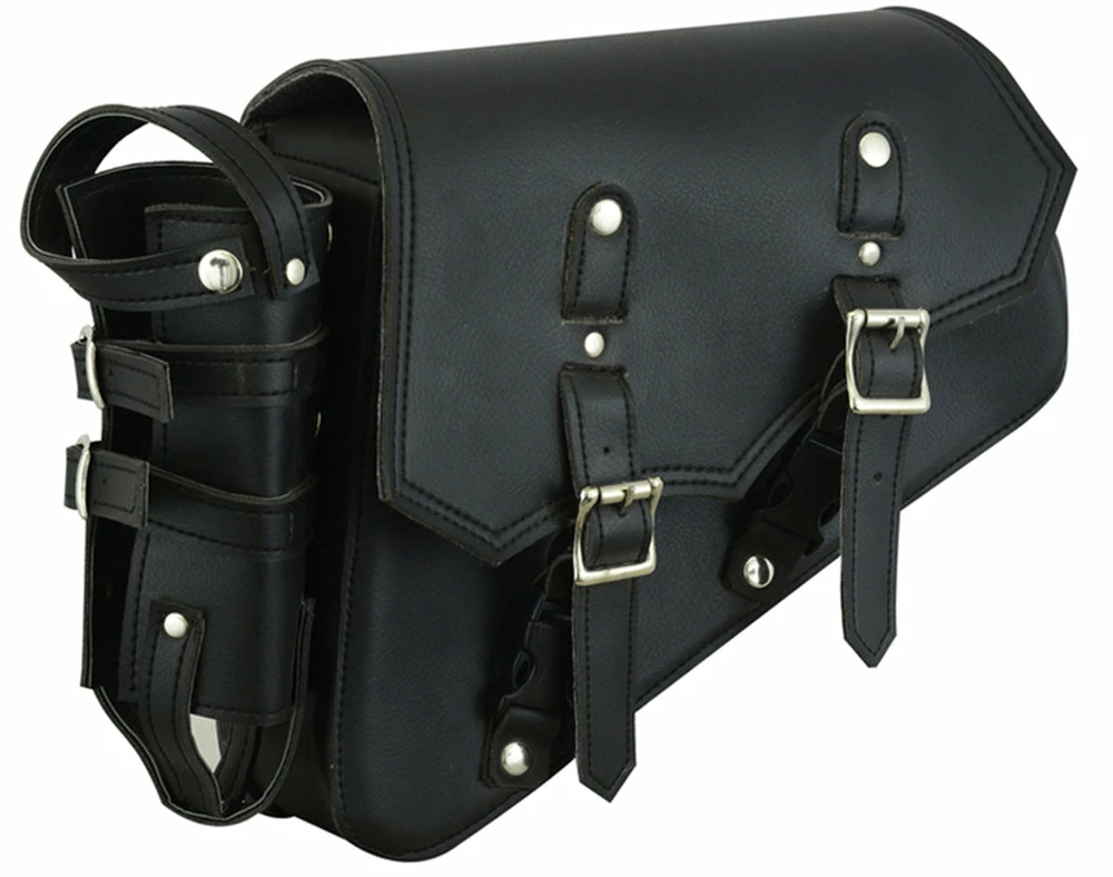 Left Side Synthetic Leather Swing Arm Bag W/Bottle Holder, Gun and Ammo holster.