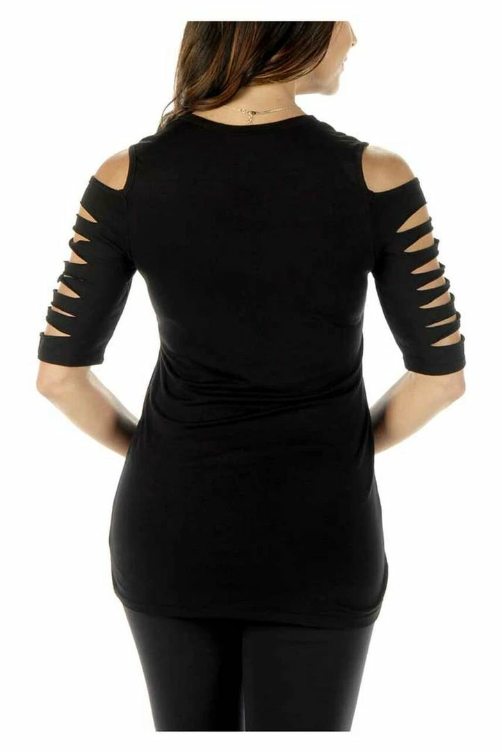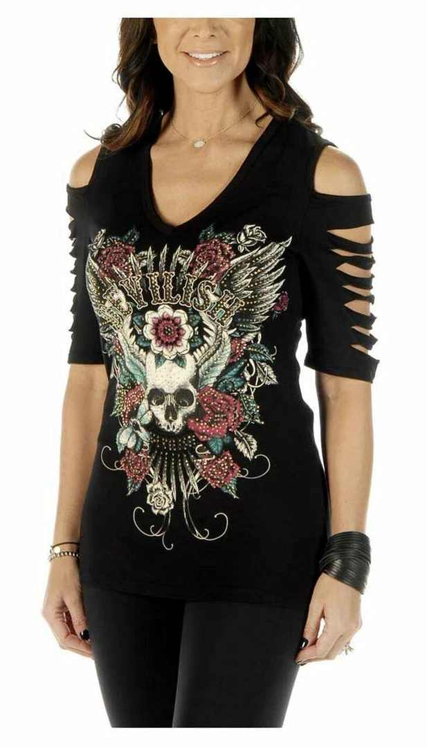Liberty Wear Women’s Devilish Cuts Half Sleeve Top – Black, 7223 BLK. A great addition to any wardrobe, this fitted top has an edgy look. Cold shoulders half sleeve top with a flattering v-neck. Devilish embellished skull graphic with sexy laser cut slash sleeves. Made from 95% rayon and 5% spandex. Pull together a hot look in seconds with this stylish tee. Proudly made in the USA.