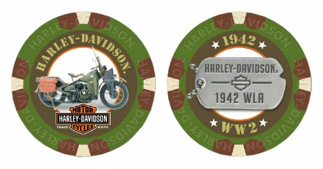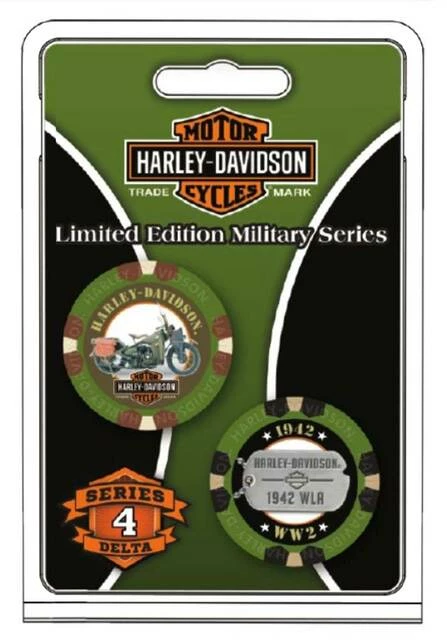 - Harley-Davidson® Military Series (Delta) 4 1942 WLA Limited Edition Collector’s Poker Chip Packs – Green & Black, 6744. Great collector’s item of H-D® Motorcycles used in World War 1 and World War 2. Package Size: 3″ x 5″ x 0.5″. Collect them all! Proudly Made in the USA.