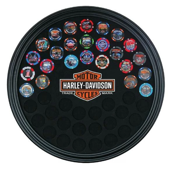 Harley-Davidson® Trademark Round Poker Chip Frame, 6988. Mounts on your wall, great way to show off your collection. Its elegant round shape blends well in any decor throughout your home. It features the renowned Trademark Bar & Shield logo imprinted in center. Traditional black molding frame with a plexiglass on front to protect your chips. Holds 47 collectible H-D® chips. (Chips are not included) Velour-felt slots holds chips securely. Specially cut molding design with black finish. Includes handing bracket on back. Size: 18″.
