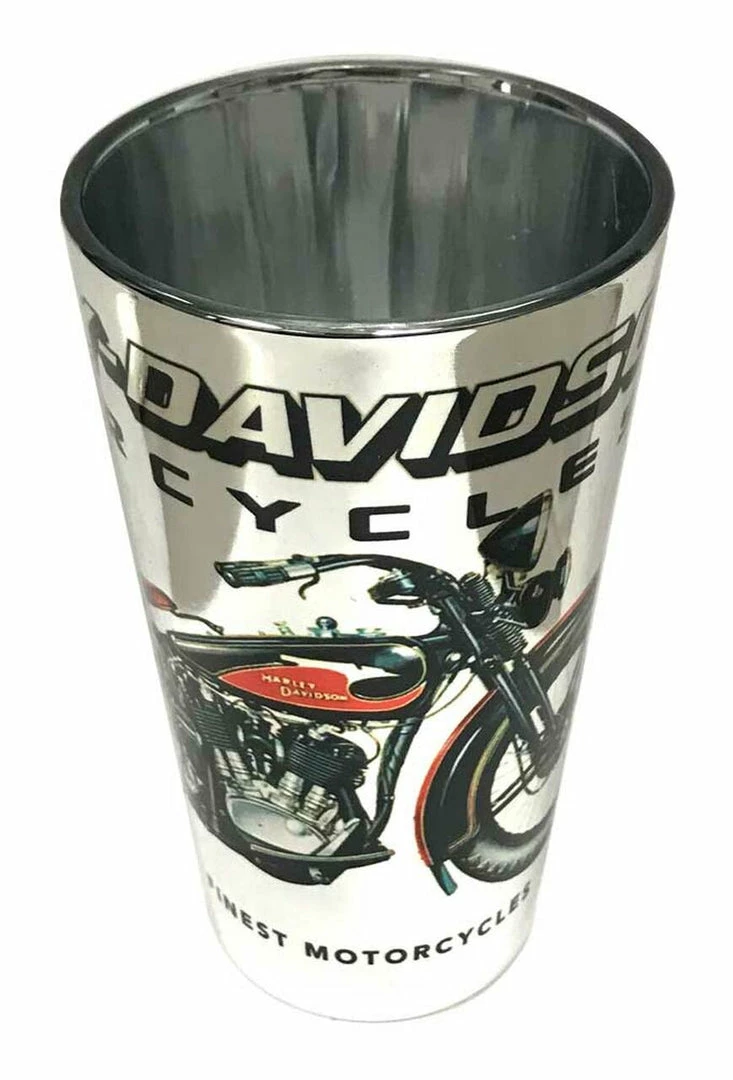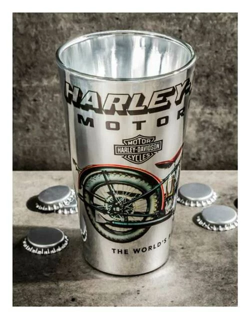 New 16 oz. pint glass raises the bar for drinkware. Durable and light weight. Sleek shiny and glossy silver glass with an awesome screen printed vintage motorcycle graphic.