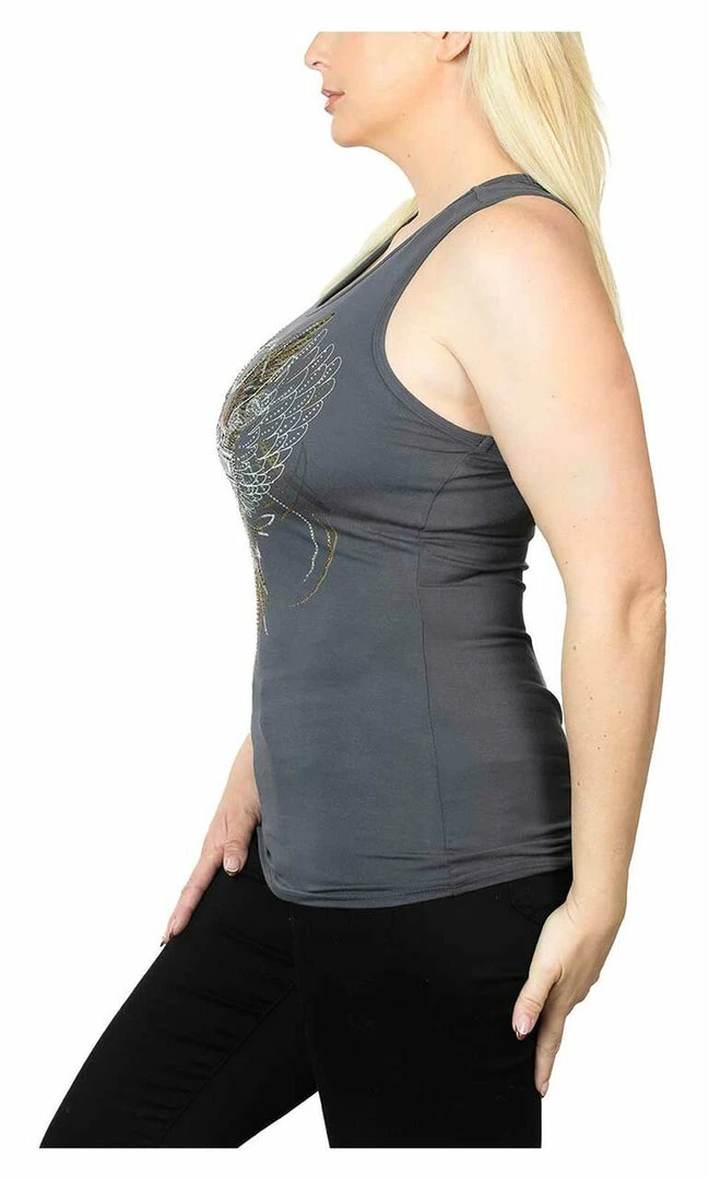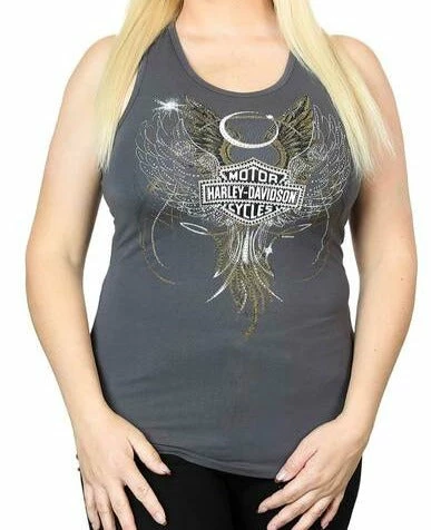 Harley-Davidson® Women’s Moon Sceptor Embellished Sleeveless Top – Gray, HT4652GRY. Stunning winged Bar & Shield logo design with alluring multi-colored rhinestones to add a dash of shimmer. Flattering ruching racerback and round neckline. Extremely soft and silky high-quality material. Styled from ever-flattering rayon-blend that hugs your curves beautifully, made of 95% rayon and 5% spandex. Ideal tank to pair with your favorite denim! Made in the USA.