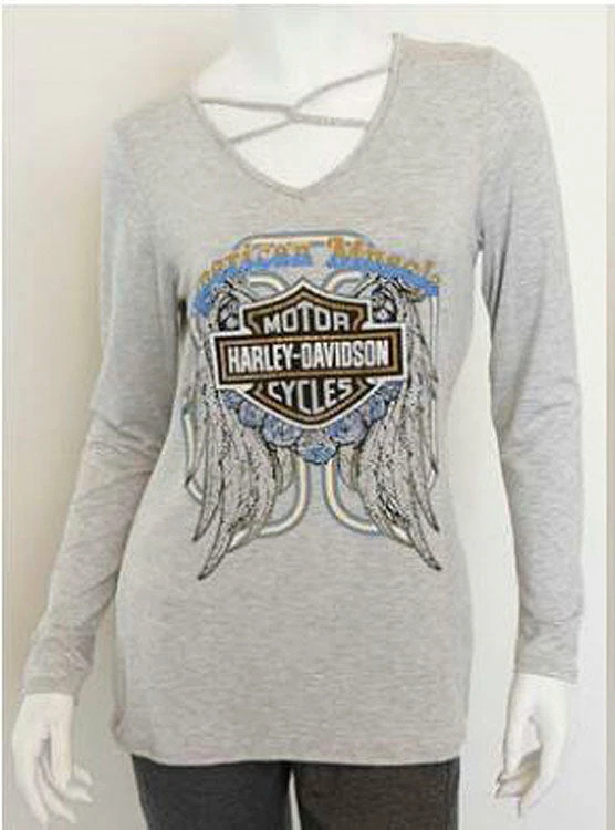 If powerful imagery inspires you, the H-D® Vintage Muscle V-Neck will send you soaring. Made from a luxuriously soft and comfortably responsive rayon/spandex blend, this long-sleeved knit top features a flattering V-Neckline with something extra: criss-cross lacing. The printed graphics start with the endearing American Made headline complementing the iconic Bar & Shield® logo taken to the super-natural with the glorious addition of feather-detailed wings. Add the celestial glimmer of hundreds of rhinestones and this top leaps to must-have status. Unleash your inner fashionista and take your casual wear to new heights.