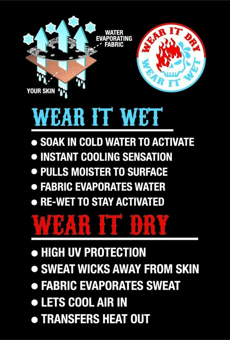 The Hi-Tech Soaker Fabric will keep you cool and covered from the heat. You can wear it dry like a normal EZ Tube. Then when it is time to cool down you can soak it in COLD water, wring out, and wear! Cool down and ride on!