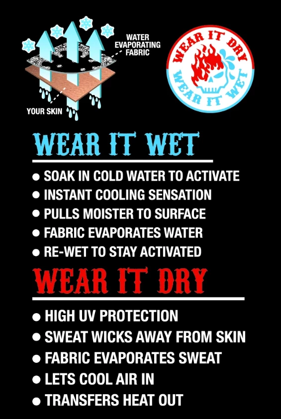 The Hi-Tech Soaker Fabric will keep you cool and covered from the heat. You can wear it dry like a normal EZ Tube. Then when it is time to cool down you can soak it in COLD water, wring out, and wear! Cool down and ride on!