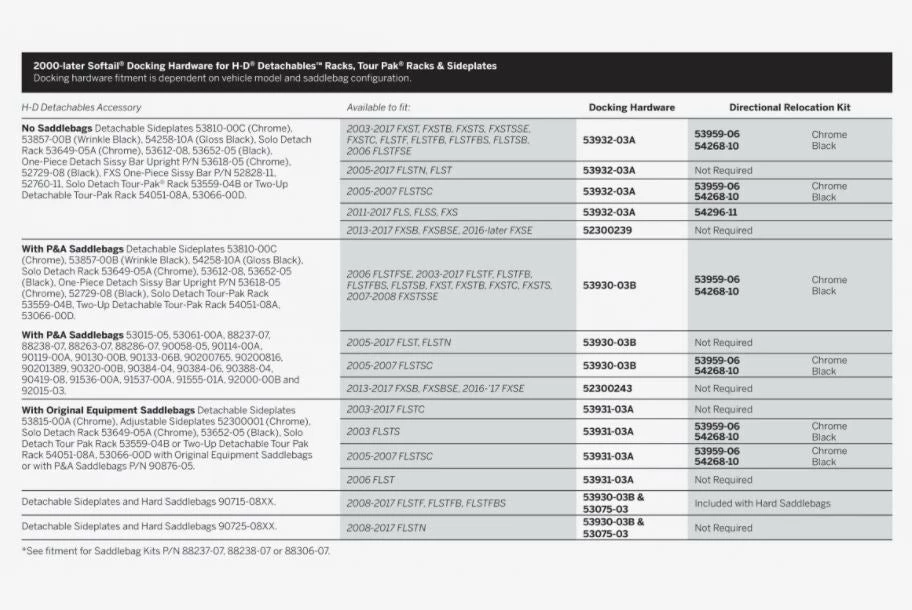 - Fits ’00-’17 FLST, FLSTF, FLSTFB, FLSTFBS, FLSTN, FLSTNSE, FLSTSB, FLSTSC, FLSTSE, FXSB, FXSBSE, FXST, FXSTB, FXSTS, FXSTSSE and ’06 FLSTFSE models with or without saddlebags (except Heritage Saddlebags P/N 90876-05). Requires separate purchase of Docking Hardware Kit and may require Directional Relocation Kit. See chart for your application.