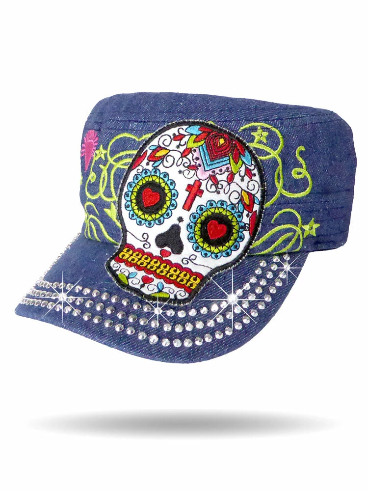 Sport an ultra-fashionable and ultra-cute blinged out cadet cap this season! This design is complete with a Sugar Skull and adorned with plenty sparkling of rhinestones, so you’ll be sure to turn heads! Excellent quality vintage cadet cap. Beautiful colorful Sugar Skull embroidered design and lined with stunning rhinestones. Made from high-quality 100% cotton. One size fits most with its adjustable velcro back closure. Perfect for a pony tail!