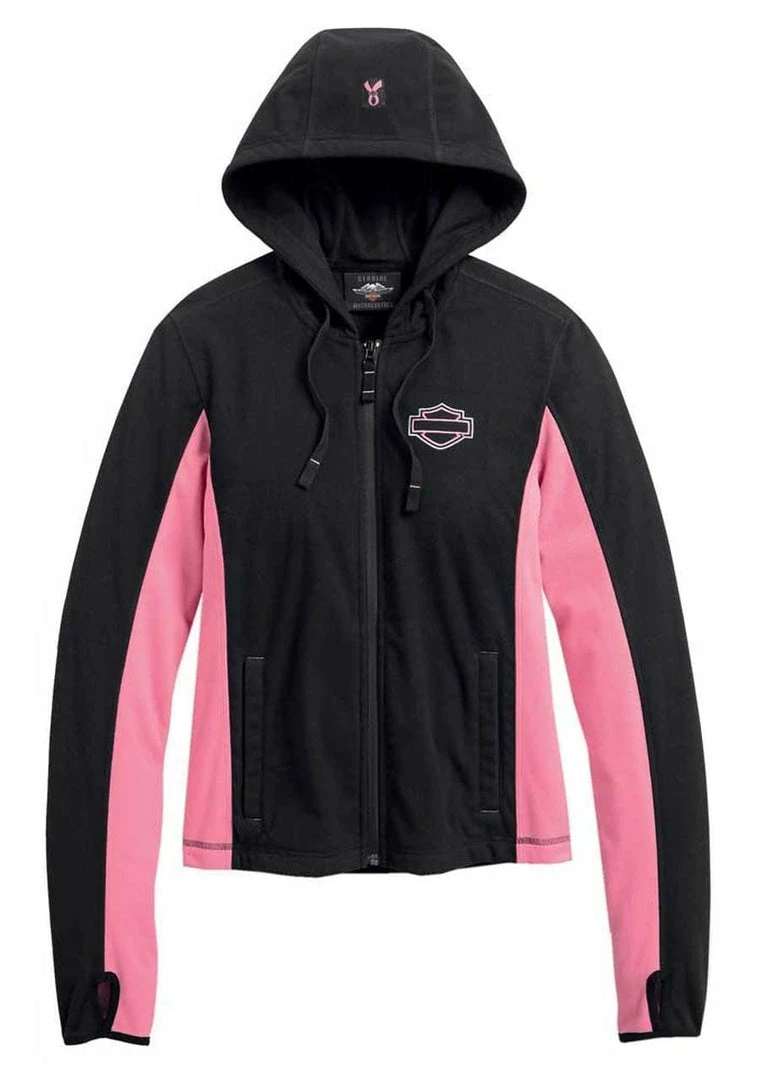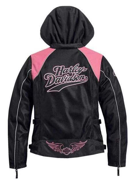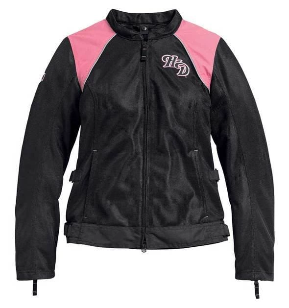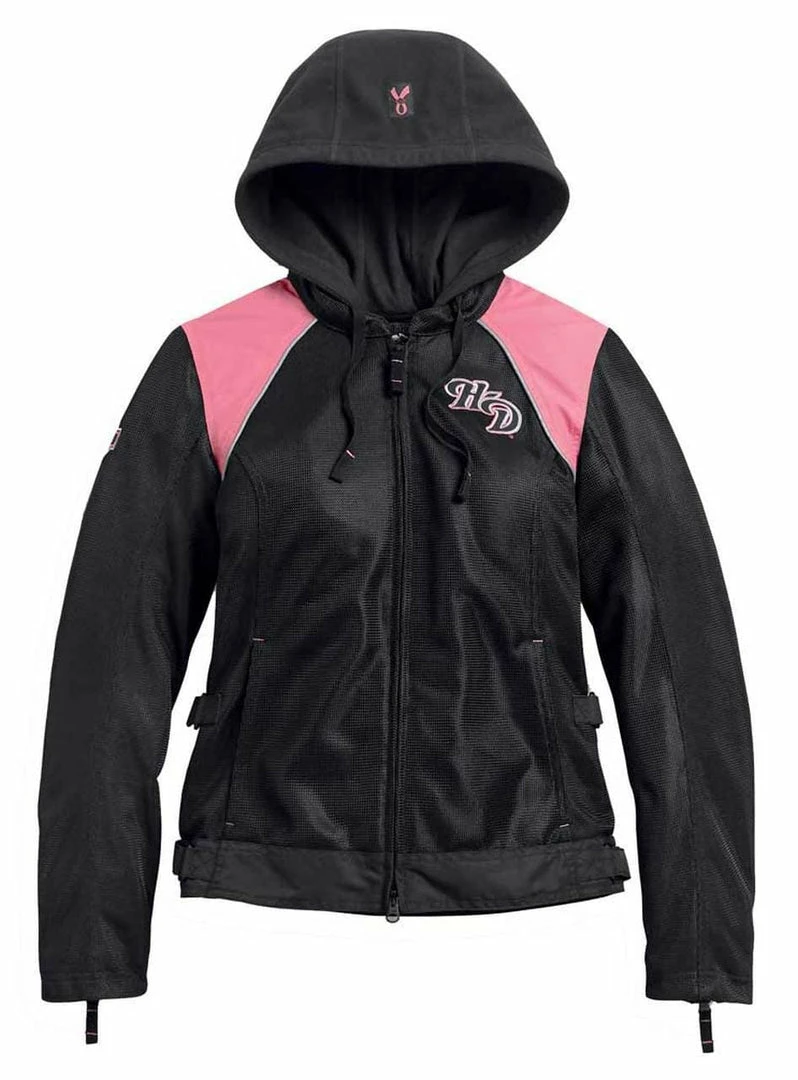 Extremely versatile! Hot, wear just the mesh outer layer. Cooler, add the hoodie for extra warmth. Mesh outer jacket for cooling airflow. Removable windproof polyester microfleece full-sleeve hoodie for extra warmth can be worn separately. Features drawstring hood, thumbholes on cuffs, snap hand-warmer pockets, embroidered graphics, and woven label. Pre-curved sleeves. Adjustable waist tabs. Body armor pockets at elbows and shoulders fit lightweight body armor (98071-05VR, sold separately). Back body armor pocket fits lightweight Dainese Pro-Armor back body armor (98317-19VR, sold separately). Mandarin collar. Two-way zipper front. Zipper cuffs. Reinforced shoulders. 3M™ Scotchlite™ Reflective Material piping. Zipper hand-warmer pockets. One interior zipper pocket. Embroidered and appliqué graphics. Made from 100% polyester mesh. Polyester mesh lining. Pink Label line is dedicated to support people touched by breast cancer. The all new Pink Label styles capitalize on the athletic trends and popular performance technologies for styles that are great to wear at walks and rallies. Styles feature the original Pink Label pink, giving customers a new reason to refresh their Pink Label wardrobe.