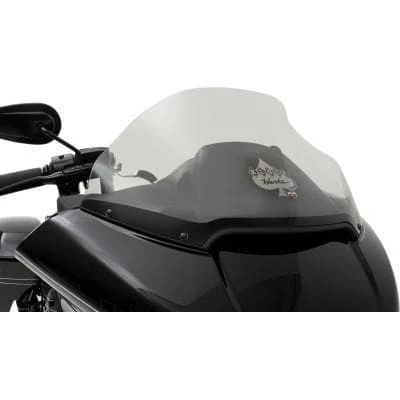 - The patented design features “hips” at the sides that re-route the wind away from riders while adding downforce to the front-end of the motorcycle to improve stability vs. riding with the stock windshield