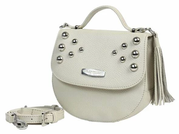 Pockets include interior zip pocket and back zip pocket. Adorable and secure flapped top with a magnetic closure. Both stylish and functional, this purse gives you plenty of room for all of your must-haves with a convenient adjustable/detachable crossbody strap. Made from soft, cream milled genuine cowhide leather. Shiny nickel Harley-Davidson® medallion and over-sized dome studs. Silky poly python printed lining.