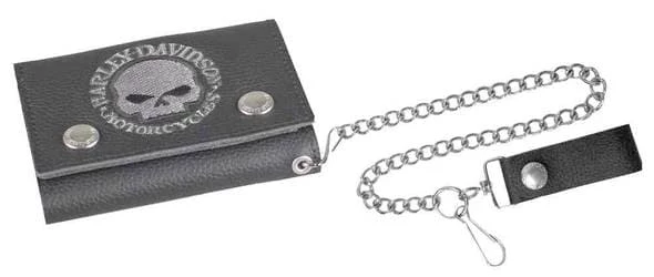 The Willie G skull is embroidered in grey on black pebbled leather. The Harley-Davidson® Motorcycles logo has that eerie font that has become famous over the last two decades. In addition to the embroidery, the wallet has two nickel logo snaps for a secure closure, and a 19-inch nickel chain with a belt leash. If you don’t want to use the belt loop, you can secure the chain with the clip that is also attached to the end of the chain. The wallet is sized perfectly at 4.5 x 3.5-inches. There is an inside zipper pocket and slots for credit cards and ID’s.