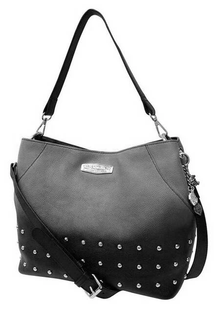 Harley-Davidson® Women’s Ombre Leather HOBO Purse – Gray & Black, OL1413L-GRYBLK. Secure top zippered pocket. Fixed shoulder strap with a bonus detachable adjustable crossbody strap. Crafted from pebbled genuine cowhide leather that is dip dyed black for a gradient effect. Decorated with a shiny nickel Harley-Davidson® medallion, accented with dome studs and a signature hanging charms. Silky poly-blended black interior lining. Size: 11″ L x 10″ H x 5″ D.