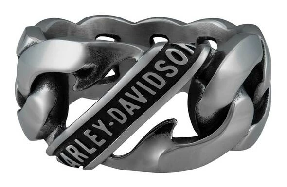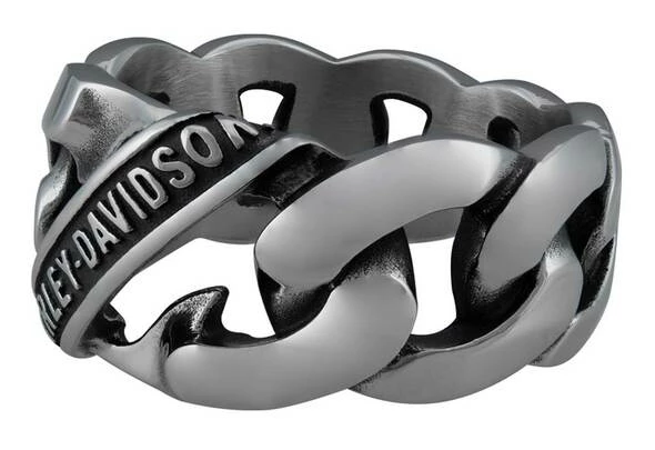 - Harley-Davidson® Men’s Banner Curb Link Steel Band Stainless Steel Ring HSR0084. A gnarled design, featuring chain links, with Harley-Davidson® script banners decorating the band. This ring is crafted out of stainless steel. This ring will hold up ride after ride. Hand crafted with the highest attention to detail and quality. Perfect for any Harley enthusiast. HSR0084