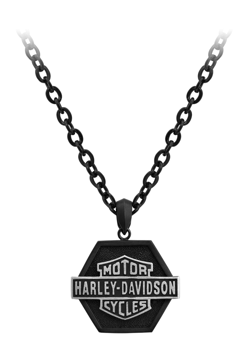 Features black stainless steel octagon with a sculpted Bar & Shield logo on a black stainless steel chain. Made from sharp and stylish black stainless steel.