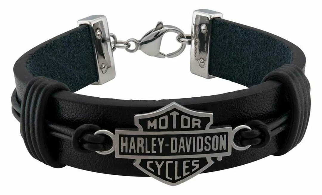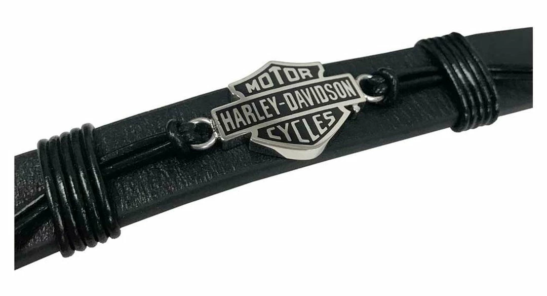 Such an unique addition added to the Harley-Davidson® collection. Features a stunning cord and leather band with steel hardware. Attached is a time-less sculpted Bar & Shield logo. Black leather gives this bracelet a true biker look. Constructed from durable leather and stainless steel construction. Secure lobster clasp. This bracelet will hold up ride after ride. Hand crafted with the highest attention to detail and quality.