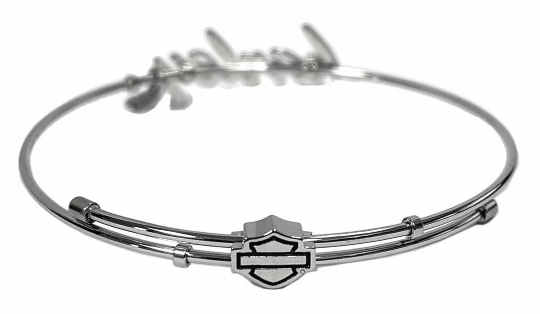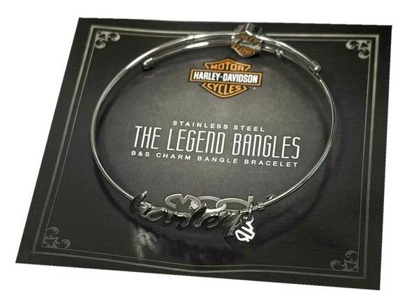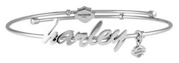 - Harley-Davidson® Women’s Cursive Harley Bangle Bracelet, HSB0133. Constructed from durable Stainless Steel, great for everyday wear. Adorable sculpted cursive Harley® script with a hanging Bar & Shield logo charm. Mod Jewelry is hand crafted with the highest attention to detail and quality, utilizing the finest materials. HSB0133