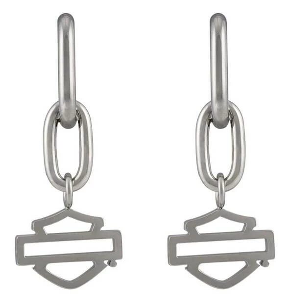 Harley-Davidson® Women’s Large Chain Bar & Shield Drop Earrings, HSE0015. Large chain links, with dangling Bar & Shield make up this classic looking pair of earrings. A more rugged take, on a classic design, for the lady who doesn’t need all the bling, and frills. Made of durable stainless steel. Hand crafted with the highest attention to detail. These earrings are perfect for every day use, and will hold up ride after ride.