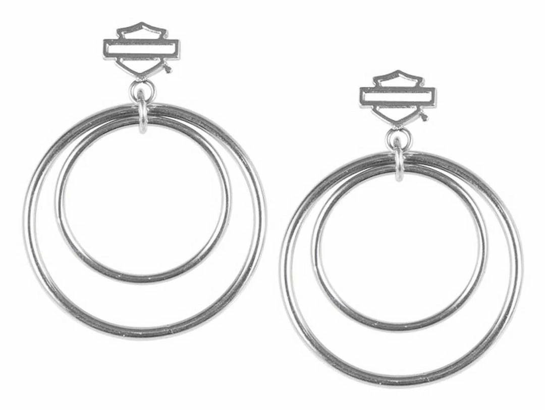 A great new design addition to the Harley-Davidson® line. Constructed from high-quality, Stainless Steel. Time-less silhouette Bar & Shield logo with two hoops dangling from it. Hoop earrings with a secure butterfly backing. These earrings are hand-crafted with the highest attention to detail and quality, utilizing the finest materials. Wear these earrings for instant style.