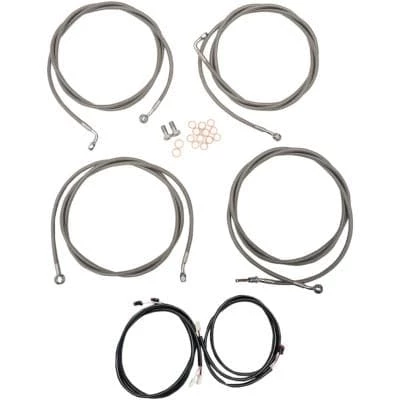 - Stainless braided kits include throttle cable, idle cable (except 08-15 Dressers), clutch cable, brake lines, chrome “T” brake line junction, banjo bolts, fittings and copper crush washers