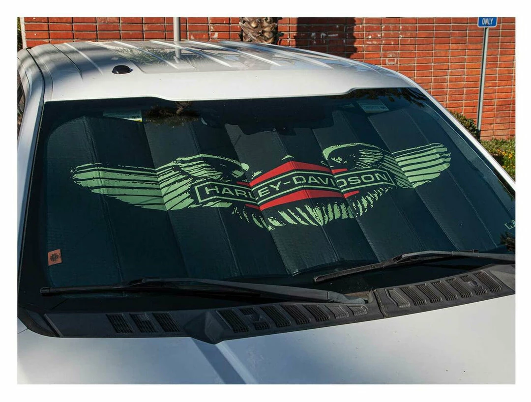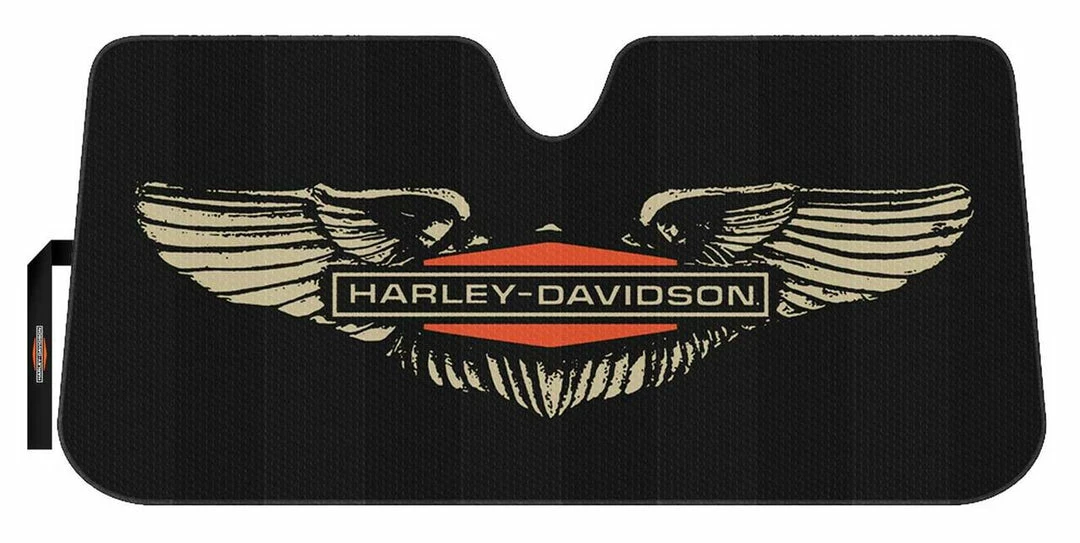 - Harley-Davidson® Distressed Wing Accordion Auto Sunshade – Black, 3935W. Protects and cools your car’s interior well it sits. Blocks damaging UV rays. Universal fit, approx. 27.5″ x 58″. Easy installation. Just press the sunshade against windshield and pull down visor to hold in place. Can be used with either side out.