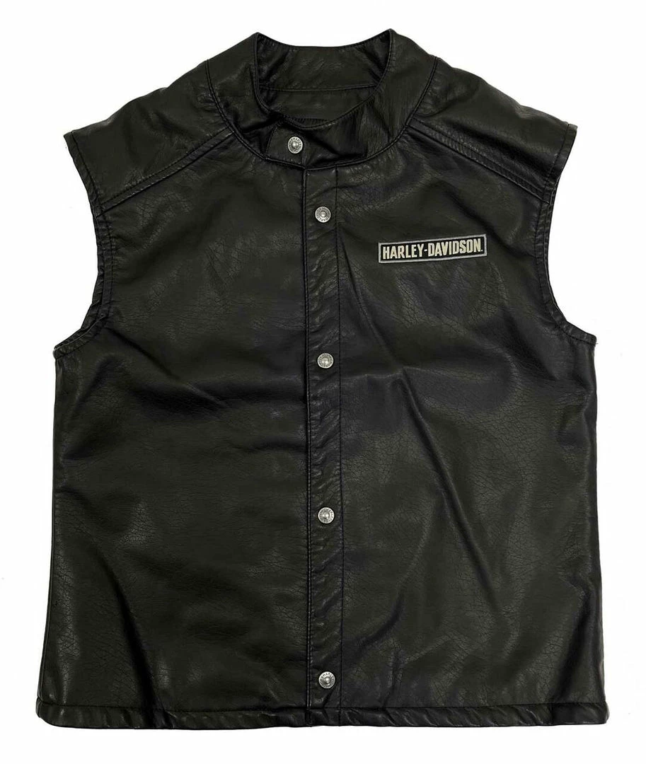 This vest has all the detailing of Dad’s vest, only it’s smaller. With four front snap buttons, seams across wide front straps and down the sides, the detailing on this boy’s vest is amazing. A woven Harley-Davidson® Bar & Shield® logo is on the back. The vest is made with polyurethane Pleather, a faux leather that has the look and feel of the real thing. It is lined with a quilted polyester fabric, which is smooth and shiny, just like satin. It’s perfect for your little man – just like Dad.