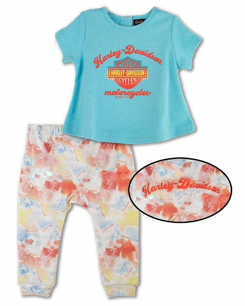 Soft and light-weight. Light blue Red “Harley-Davidson Motorcycles” script make up the front of this top. Matching tie-dye pants that has a “Harley-Davidson” on the back bottoms. Perfect for your little Harley gal!